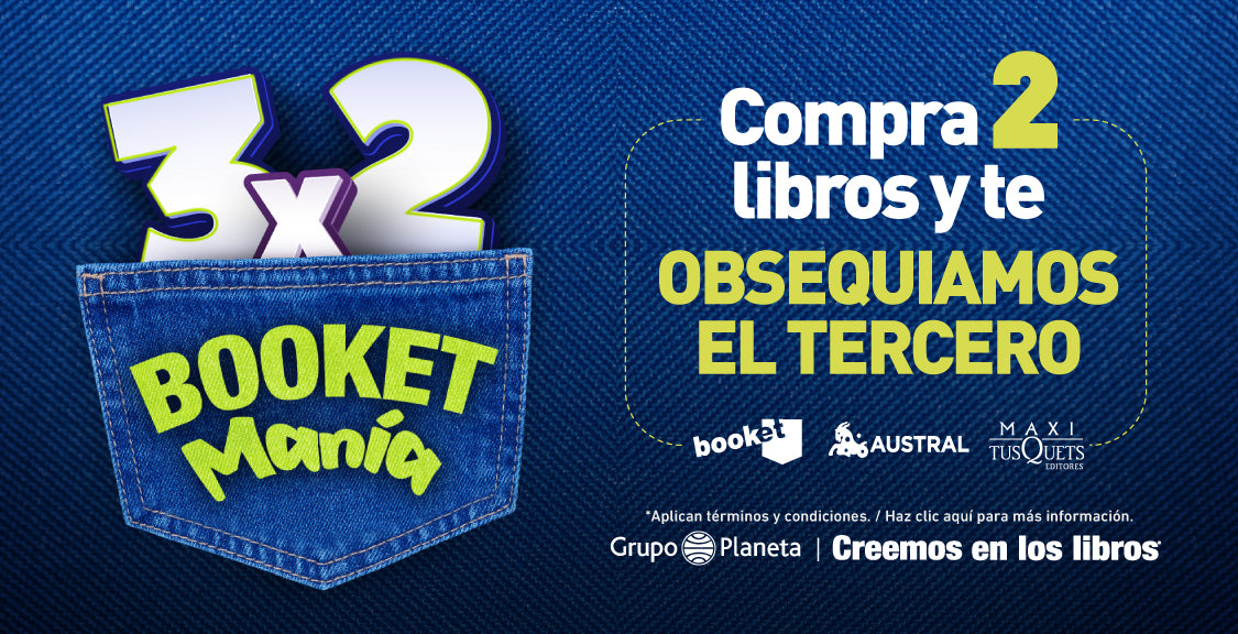 Compra 2 libros y te obsequiamos el tercero; Participan las editoriales Booket, Austral y MaxiTusquets. Coloca en el carrito de compras el código BOOKETMANIA.