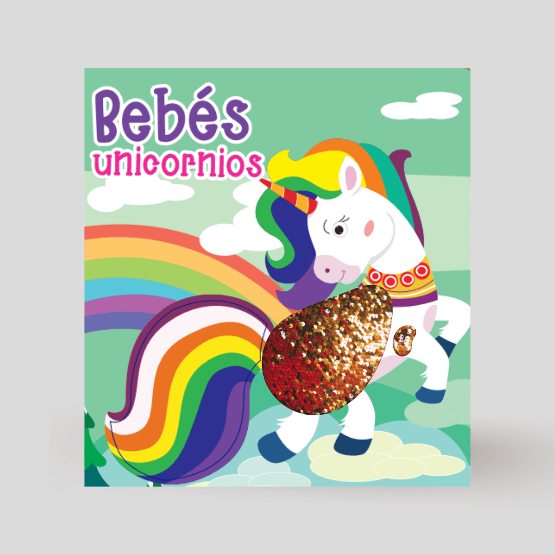 Bebes Unicornios Sequence. Libros preciosos en formato pequeño ideal para las manos de nuestros bebés, aprendizaje de las primeras palabras acompañados de tiernos animalitos baby con el sistema sequence que cambia de color en sus lentejuelas al deslizar la mano.
